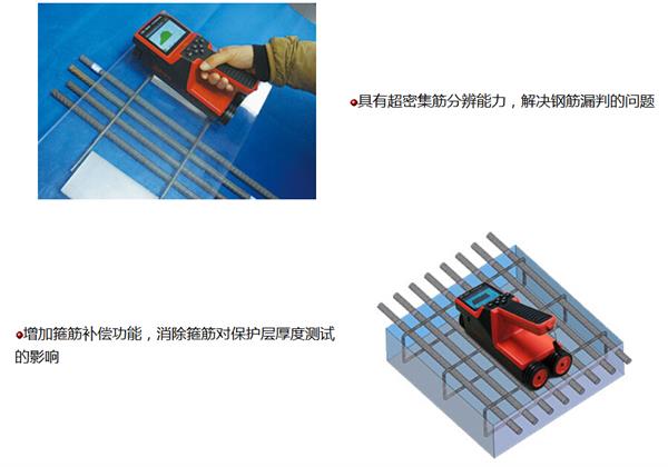 混凝土中鋼筋檢測技術規(guī)程-----------------------------------------------JGJ/T152-2008 主機與傳感器合成一體 應用領域: 橋梁、隧道、墻體等混凝土結構工程中鋼筋位置、鋼筋分布及走向、保護層厚度、鋼筋直徑的探測;也可對非鐵磁性介質中鐵磁體及導電體(如電線、管線)走向及分布進行探測探測;混凝土結構施工質量驗收檢測;對在建結構的安全性和耐久性進行評估;對舊有結構進行評估、改造時對配筋量的檢測; 對樓板或墻體內的電纜、水暖管道等分布及走向進行探測。