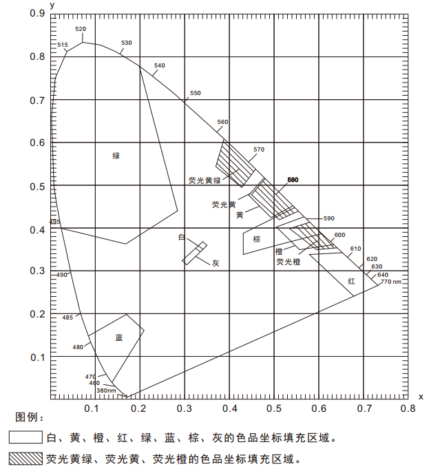 上述標準中,通常給出一塊顏色區(qū)域(多個色品坐標點)和亮度因數(shù)要求,在D65/A光源和45/0幾何條件下,判定樣品是否落在對應(yīng)的顏色區(qū)域內(nèi),借此判定樣品是否滿足標準規(guī)定的色度要求。由于顏色區(qū)域為多邊形,如下圖所示,導致使用普通的分光測色儀無法完成判定。NS808測色儀配合SQCT軟件的交通路標測量模塊則可以輕松解決這方面的問題。